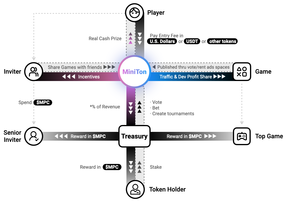 Билеты игроков могут быть оплачены фиатной валютой, стейблкоинами или игровыми жетонами. Доход MiniTon может выражаться в бумажной валюте, стейблкоинах или игровых токенах. Разнообразие валют доходов повысит финансовую устойчивость MiniTon.